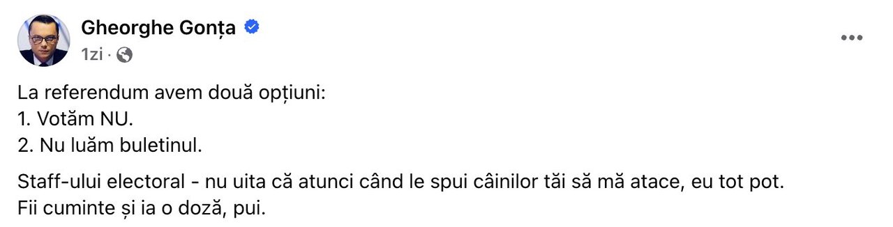 ”Pe 15 octombrie, Gheorghe Gonța a postat un îndemn pe pagina personală de Facebook. La referendum avem două opțiuni, spunea el, făcînd referire la votul „NU”, fie la boicotarea scrutinului.”