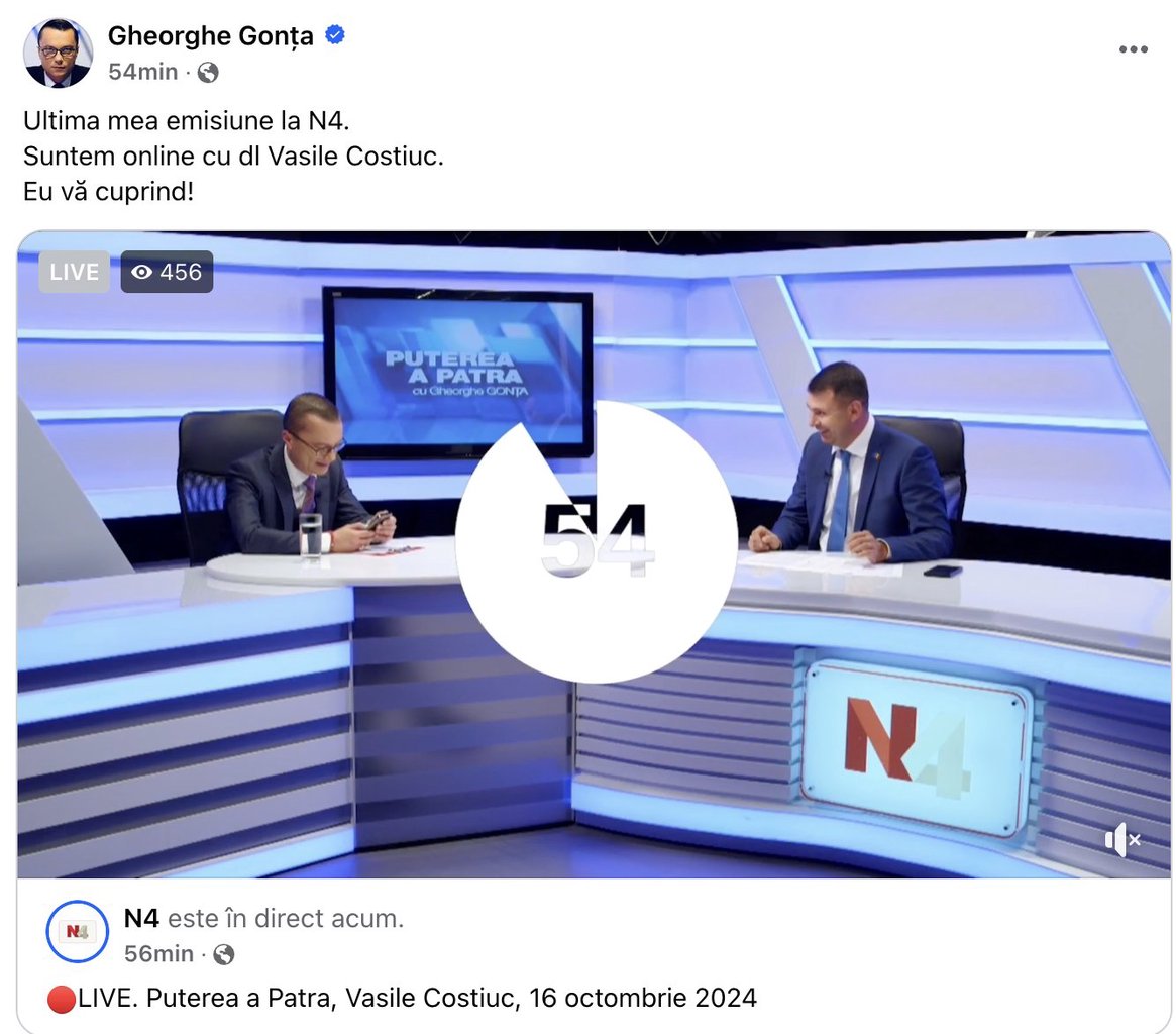 Pe lîngă activitatea de la N4, Gheorghe Gonța moderează emisiunile live ale președintelui Partidului Nostru, Renato Usatîi, candidat la prezidențiale. Anterior, jurnalistul a anunțat că are un contract oficial întocmit și că ar fi gata să-i presteze astfel de servicii și șefei statului în exercițiu, Maia Sandu.