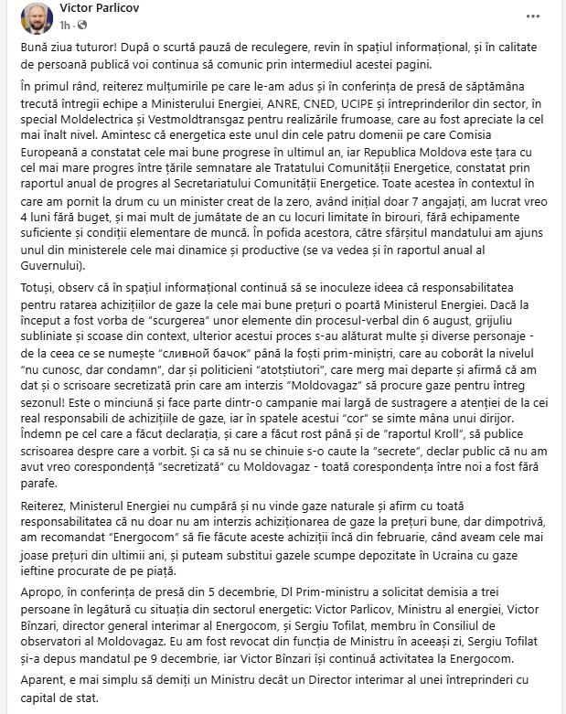 Este reacția fostului ministru al Energiei, Victor Parlicov, după ce în „spațiul informațional continuă să se inoculeze ideea că responsabilitatea pentru ratarea achizițiilor de gaze la cele mai bune prețuri o poartă” instituția pe care a condus-o.