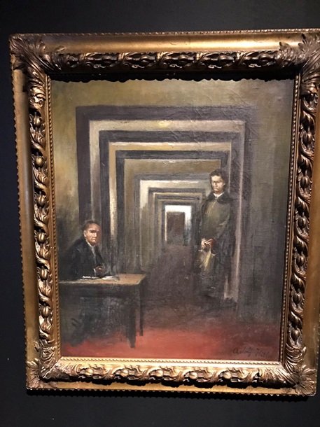 На небольшом холсте, выполненным маслом в темных тонах, изображены женщина и сидящий за столом мужчина на фоне уходящего вдаль коридора, создающего иллюзию бесконечной перспективы.