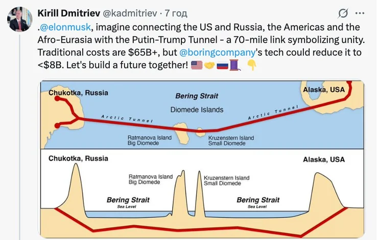 "Представьте себе, что вы соединяете США и Россию, Америку и Афро-Евразию тоннелем Путина-Трампа — 70-мильным сообщением, которое символизирует единство. Традиционные расходы составляют более 65 миллиардов долларов, но технологии компании The Boring Company, основанной Илоном Маском, могут снизить эту сумму до менее чем 8 миллиардов долларов. Построим будущее вместе", — написал он в социальной сети X.
